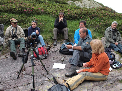 Lasciati i fuoristrada che ci hanno gentilmente portati in quota, ci incamminiamo lungo la valle, destinazione il Lago del Sasso (1900 m s.l.m. circa). Ci accolgono subito i primi canti: zigolo giallo, stiaccino, culbianco, ballerina bianca e gialla, scricciolo, cuculo, averla piccola, rondone, capinera e beccafico. In alto, sopra le creste, vola uno stormo di gracchi. Sui sassi si vedono diverse marmotte, abbastanza confidenti. Sbinocolando lungo il sentiero osserviamo ancora intere famiglie di stiaccini, alcune averle piccole e gruppetti di fanelli e organetti, passera scopaiola, corvo imperiale e gheppio. Lungo il torrente si fa ammirare per qualche secondo un merlo acquaiolo. Più in alto molti di noi osservano un MERLO DAL COLLARE. Non mancano i mammiferi: diversi camosci e due bellissimi stambecchi, stagliati sulla cresta del Pizzo dei Tre Signori, imponenti in quello scenario brullo e selvaggio. Ci fermiamo a mangiare sulle sponde del lago, dove viene presentato ai soci l’annuario CROS 2010 ed Enrico Viganò ci aggiorna sull’atlante dei nidificanti di Ornitho. Scendendo vediamo un bellissimo BIANCONE e un’aquila reale. La giornata si conclude al rifugio delle Bocche di Biandino, dove salutiamo questa bellissima valle.