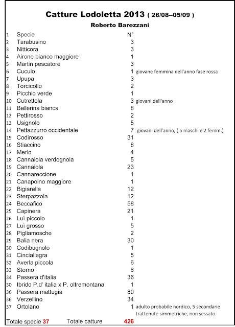 Dati relativi alle catture eseguite presso il centro di inanellamento “La Lodoletta” Riserva Pian di Spagna (CO). Dati di Roberto Barezzani.