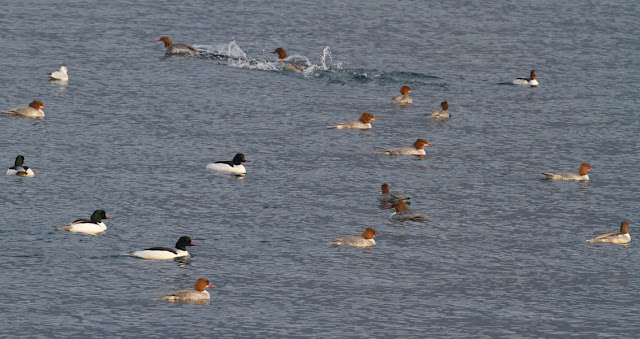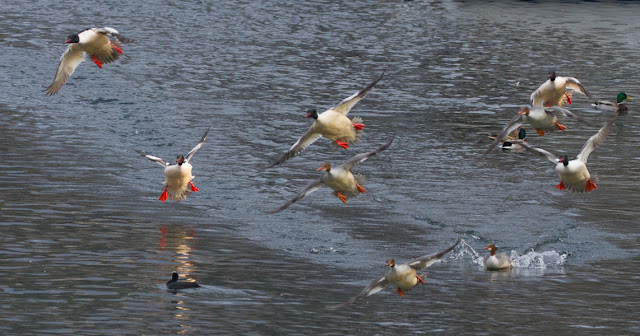 presumo che questa concentrazione di 62 smerghi sia dovuta essenzialmente per fattore alimentare, sul lago di Como lo smergo maggiore è nidificante dal 2002. Nel mese di novembre arrivano i maschi e si fermano fino a quando le femmine depongono, poi sempre i maschi, verso maggio, si raggruppano e migrano ma non saprei dire dove. Sul lago restano solo le femmine con i nuovi nati.