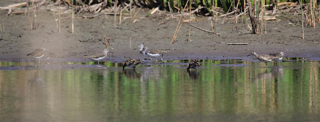 Pian di Spagna (CO), un gruppetto di limicoli così composto: Piro piro culbianco, Piro piro boscherccio e Beccaccino. Fotografia Marco Esposito