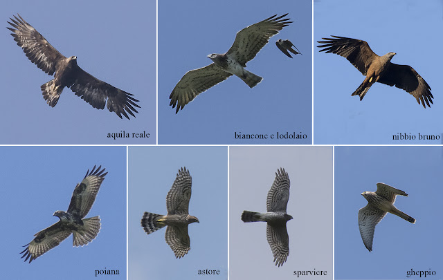 Immagine didattica comparative di diverse specie di rapaci fotografati da Giovanni Fontana nel periodo estivo sui Monti di Musso.