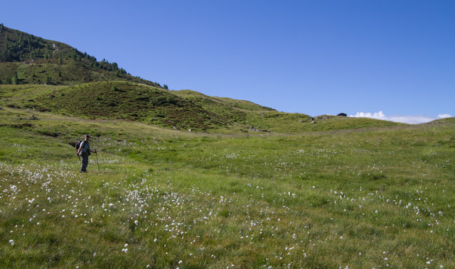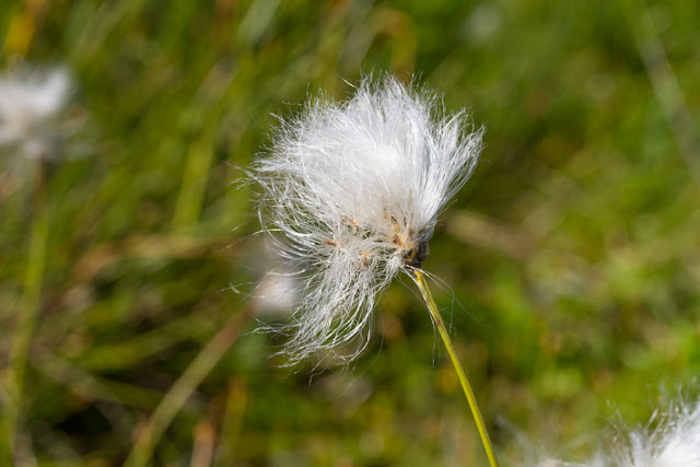 Oltre agli esperti di uccelli, nel gruppo vi sono esperti di rettili e di libellule; prendiamo il sentiero che ci conduce a un vasto prato umido, solcato da alcuni ruscelli e dove spicca la bellezza degli esili eriofori (Eriophorum angustifolium) dal caratteristico pennacchio bianco.