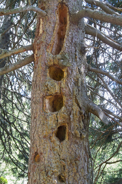 Sulla via del ritorno, avendo come meta un piccolo specchio d’acqua non lontano dal rifugio stesso, prendiamo un sentiero lungo il quale osserviamo alcuni abeti secchi sui quali sono evidenti i fori lasciati dal passaggio del picchio nero (Dyocopus martius).